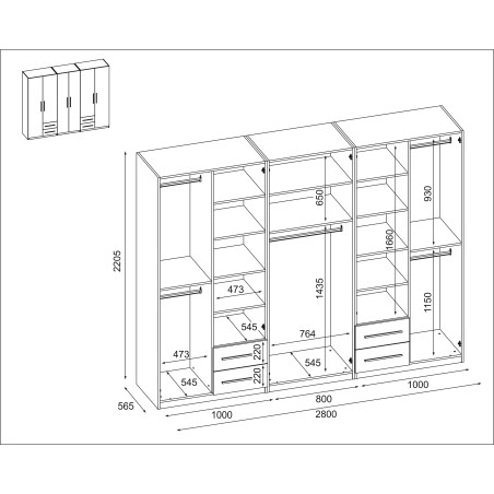 Гардероб 280/220 - щанги за дрехи, вътрешни рафтове, просторни външни чекмеджета