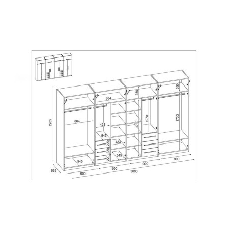 Гардероб 360/220 - лостове за дрехи, вътрешни рафтове, външни чекмеджета, шкафчета, огледало