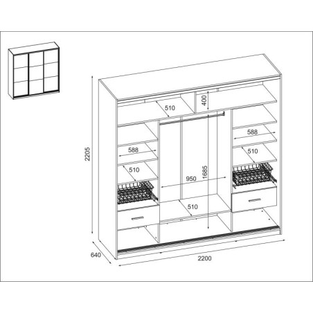 Плъзгащ гардероб 3D/220 - лост за закачалки, кошници, рафтове, чекмеджета