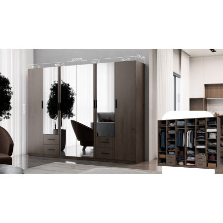Вътре в гардероба ще намерите всичко необходимо за удобно съхранение. Гардеробът е оборудван с лост за дрехи, перфектна за окачване на по-дълги дрехи като палта, рокли или костюми. До нея са разположени практични рафтове, които са подходящи като място за пуловери, тениски, чанти или спално бельо. Цялото се допълва от чекмеджета, които ви позволяват да поддържате ред в дребните елементи на гардероба като бельо, чорапи или колани.