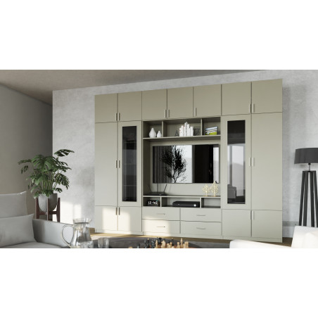 Това е мебелна стена, която може да побере наистина много – зад елегантните, затворени фасади ще скриете всички неща, които не трябва да са видими. Стъклените витрини ще ви позволят ефективно да изложите любимите си декорации, а ТВ пространството е обмислено така, че удобно да побере телевизор и мултимедийно оборудване.