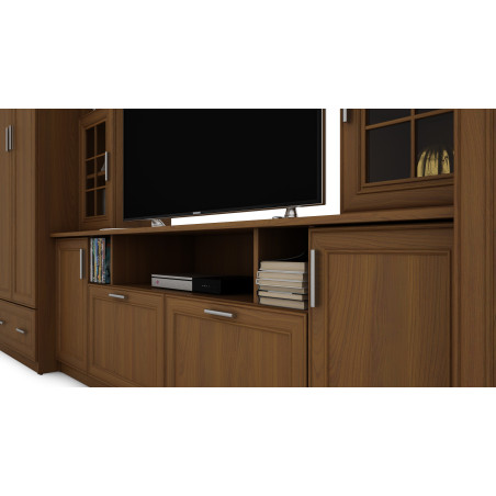 - TV шкаф с голяма ниша за телевизора и долна част с капаци, врати и ниши с рафтове.