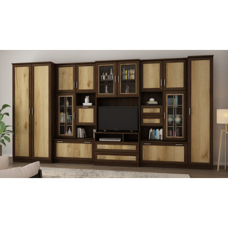 Мебелът се състои от голям гардероб с лост, бельов шкаф с пет рафта, стъклени витрини, чекмеджета, бар, отворени ниши и голяма ниша за телевизор. Това е отлично решение за хора, които се нуждаят от много място за съхранение на различни предмети, от дрехи до книги, декорации или електронно оборудване. Стенката ЛЕНА позволява поддържане на ред в стаята, като същевременно осигурява лесен достъп до нужните неща.