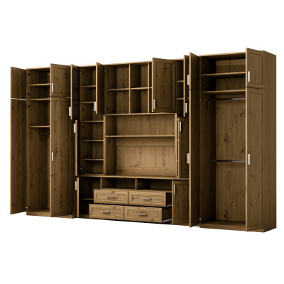 Комплектът е предназначен за хора, които искат максимално да използват наличното пространство. В представената стенка за всекидневна намирате всичко от което имате нужда – гардероб с лост за закачалки, бельевник с 5 рафта, стъклени витрини, чекмеджета, бар, открити и затворени ниши зад врати, и дори голяма ниша за телевизор с място отдолу за декодер и др.