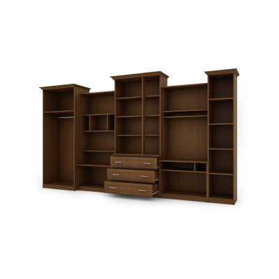 Комплектът е предназначен за хора, които искат максимално да използват наличното пространство. В представената мебелна стенка имате всичко, от което се нуждаете – гардероб с лост за закачалки, бельов шкаф с 5 рафта, стъклени витрини, чекмеджета, бар, отворени и затворени ниши и дори голяма ниша за телевизор с място за TV декодер и др.