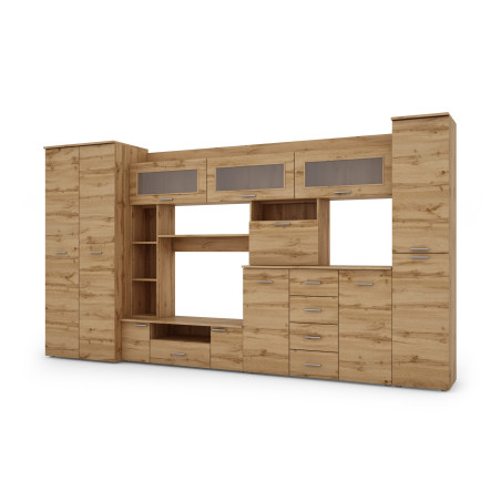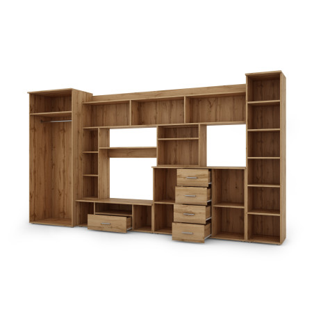 Търсите модерна мебелна стенка, която ще побере всички ваши вещи? Изберете нашата елегантна мебелна стенка КЕНА с гардероб, рафтове, чекмеджета и RTV пространство, която съчетава функционалност и естетика в едно. Тя осигурява много място за съхранение, удобни решения за показване на мултимедийно оборудване и уникални предмети като снимки, книги или елегантни стъклени изделия.