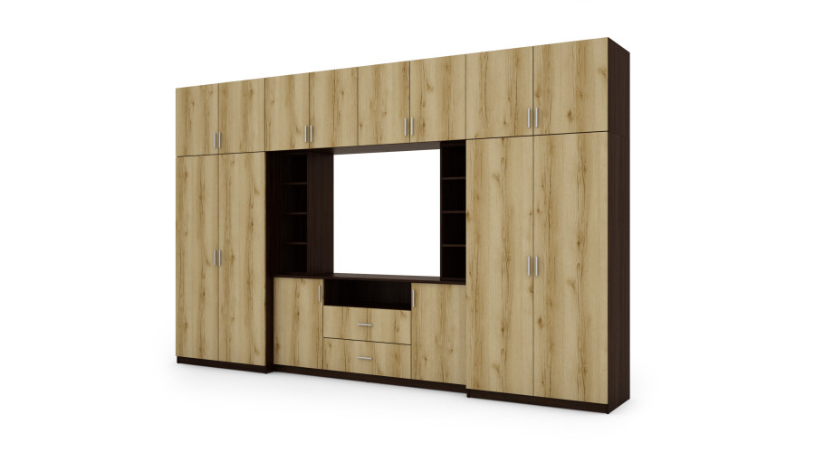 - затварящи се надстройки с рафтове по цялата ширина на комплекта, благодарение на които общата височина на мебелната стенка е цели 240 см.