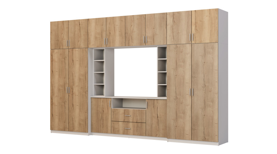 - затварящи се надстройки с рафтове по цялата ширина на комплекта, благодарение на които общата височина на мебелната стенка е цели 240 см.