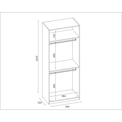Vnitřek skříně byl naplánován s velkou péčí o ergonomii. Dvě tyče na ramínka umístěné jedna nad druhou umožňují maximální využití vertikálního prostoru, umožňující ukládání většího množství košil, šatů, sak nebo kabátů. Police umístěné v horní části nábytku poskytují dodatečný prostor pro složené oblečení, doplňky nebo krabice na boty a sezónní doplňky.