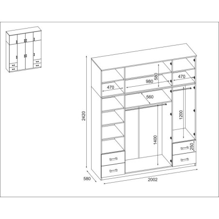 Skříň 200/242 - tyče na oblečení, vnitřní police, vnější zásuvky