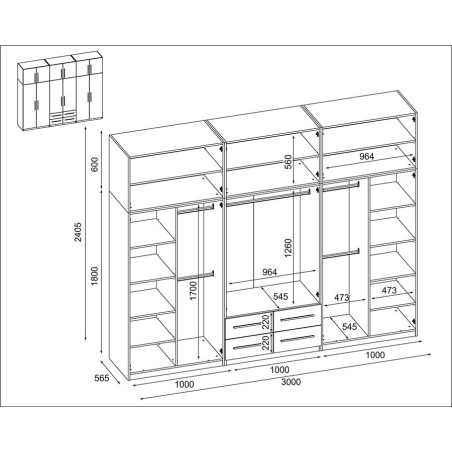Skříň 300/240 způsobí, že ložnice nebo předsíň získají na vzhledu. Je to kombinace moderního stylu s funkčností, která se osvědčí ve většině uspořádání. Vnitřek skříně je vybaven četnými policemi, zásuvkami a tyčemi na oblečení, což dává možnost uspořádat šatník.