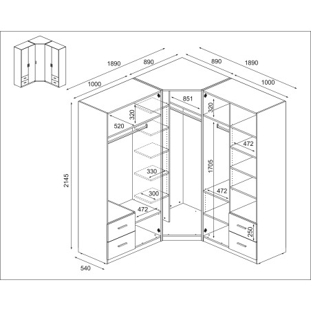 - Skříň se hodí do rohu jakékoli místnosti. Maximálně využijete dostupný prostor na obou stěnách.