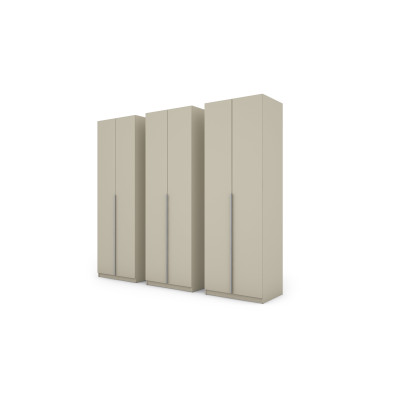 Stylová 6dveřová skříň o rozměrech 240x240 cm v odstínu kašmírové béžové je elegantní a funkční řešení do moderních interiérů. Velké zrcadlo umístěné na přední straně opticky zvětšuje prostor, dodává lehkost uspořádání a usnadňuje každodenní používání šatníku. Jemná béžová barevnost se skvěle komponuje s módními interiéry ve stylu japandi, klasickém nebo modern classic, zatímco stříbrné úchytky dodávají jemný, moderní akcent.