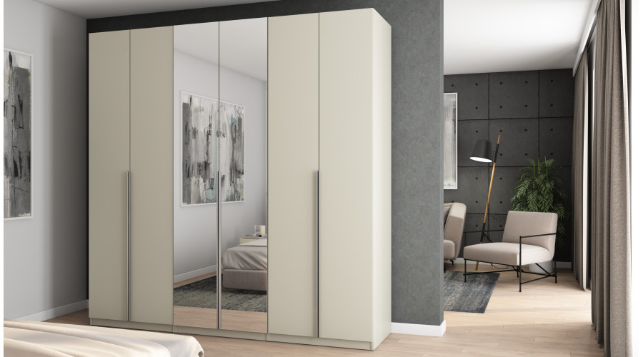 6dveřová skříň se zrcadlem 240x240 cm – kašmírová béžová se stříbrnými úchytkami
