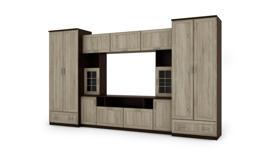 Dvě skříně tvoří hlavní část obývací stěny. To je prostorná úložná oblast, která pomáhá udržovat pořádek v místnosti. Menší uzamykatelné skříňky jsou perfektní pro skladování malých předmětů, což vám umožní udržovat pořádek v místnosti.
