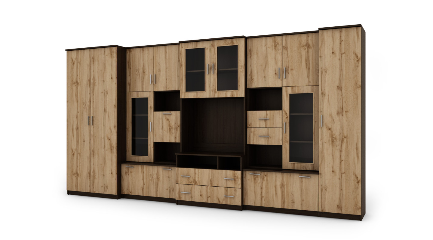 Nábytek se skládá z velké šatní skříně s tyčí, prádlové skříně s pěti policemi, skleněných vitrín, zásuvek, baru, otevřených výklenků a velkého výklenku pro televizor. Je to vynikající řešení pro osoby, které potřebují hodně místa pro ukládání různých předmětů, od oblečení po knihy, dekorace nebo elektronické vybavení. Obývací stěna LENA umožňuje udržet pořádek v místnosti a zároveň poskytuje snadný přístup k potřebným věcem.