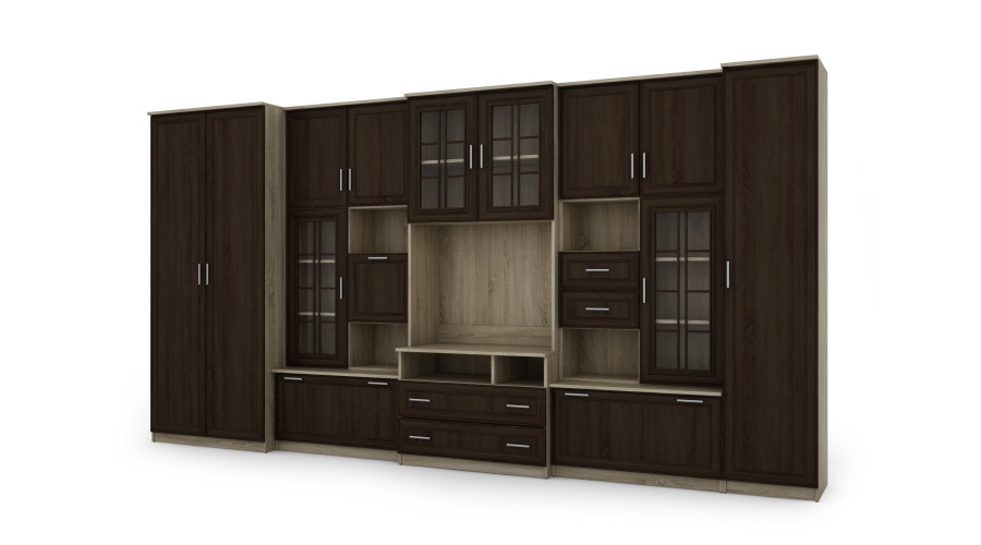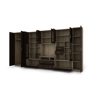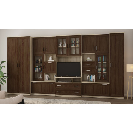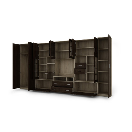 Nábytek se skládá z velké šatní skříně s tyčí, prádlové skříně s pěti policemi, skleněných vitrín, zásuvek, baru, otevřených výklenků a velkého výklenku pro televizor. Je to vynikající řešení pro osoby, které potřebují hodně místa pro ukládání různých předmětů, od oblečení po knihy, dekorace nebo elektronické vybavení. Obývací stěna LENA umožňuje udržet pořádek v místnosti a zároveň poskytuje snadný přístup k potřebným věcem.