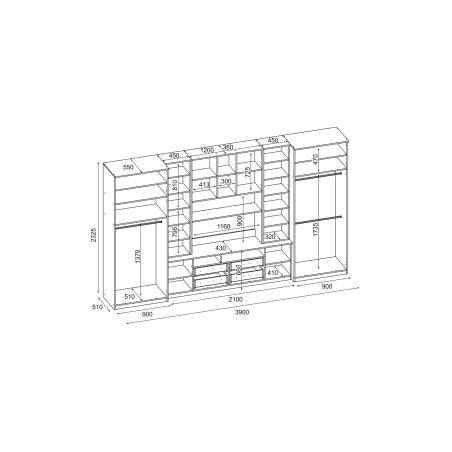 Obývací stěna SAWA je mimořádně praktický nábytek. Je velmi široká (3,90 m) a velmi vysoká (2,32 m)! Má hlubší než standardní nástavce (0,36 m) i skříně (0,55 m).