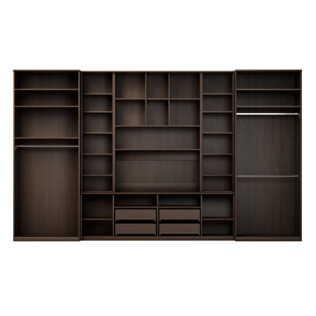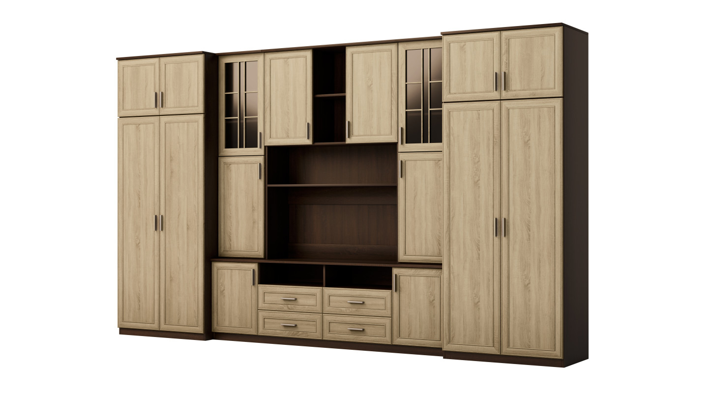Souprava je určena pro osoby, které chtějí maximálně využít dostupný prostor. V prezentované obývací stěně najdete vše, co potřebujete – šatní skříň s tyčí na ramínka, prádélník s 5 policemi, skleněné vitríny, zásuvky, bar, otevřené i zavřené niky za dveřmi a dokonce velkou niku na televizor se spodní částí na dekodér TV atd.