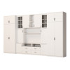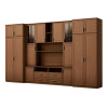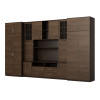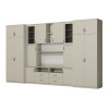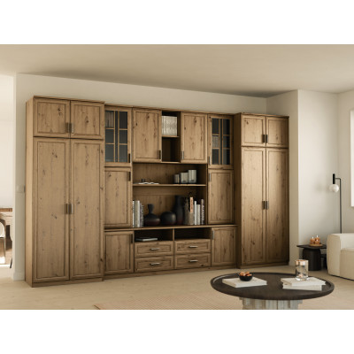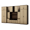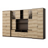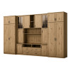 Souprava je určena pro osoby, které chtějí maximálně využít dostupný prostor. V prezentované obývací stěně najdete vše, co potřebujete – šatní skříň s tyčí na ramínka, prádélník s 5 policemi, skleněné vitríny, zásuvky, bar, otevřené i zavřené niky za dveřmi a dokonce velkou niku na televizor se spodní částí na dekodér TV atd.