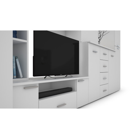 Hledáte moderní obývací stěnu, která pojme všechny vaše věci? Vyberte si naši elegantní obývací stěnu KENA se skříní, policemi, zásuvkami a místem pro RTV, která spojuje funkčnost a estetiku v jednom. Poskytuje dostatek úložného prostoru, pohodlná řešení pro vystavování multimediálních zařízení a jedinečných předmětů jako jsou fotografie, knihy nebo elegantní sklo.