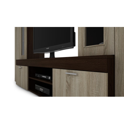 Obývací stěna Apollo je sada nábytku, která spolu harmonizuje. Vyrobeny z nejkvalitnějších nábytkových desek, které jsou odolné proti poškrábání a vlhkosti. Jejich hrany jsou pokryty odolnou PCV hranou. Celek se skládá z několika prvků, mezi které patří: TV skříňka, police, vitrina a skříňky.