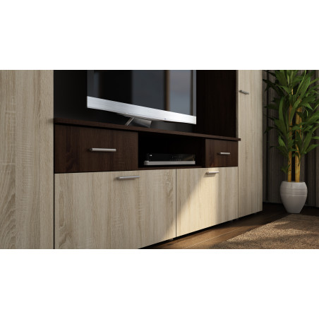 Obývací stěna s multimediální skříňkou je elegantní a funkční kus nábytku, který se bude dokonale hodit ve vašem pokoji. Komplexní systém, který spojuje police, skříňky a prostor určený pro zábavní elektroniku.