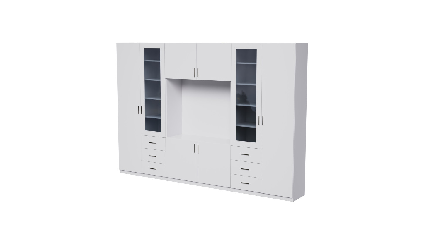 Sekce RTV umožňuje pohodlné umístění televizoru, konzole a audio zařízení, zatímco dodatečné výklenky a police pomáhají schovat kabely a příslušenství.