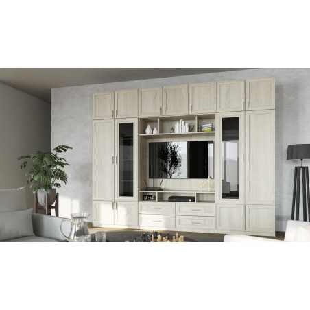 Toto je obývací stěna, která pojme opravdu hodně – za elegantními, uzavřenými čely skryjete všechny věci, které nemají být na očích. Prosklené vitríny vám umožní efektně vystavit oblíbené dekorace, a TV prostor byl promyšlen tak, aby pohodlně pojal televizi a multimediální zařízení.