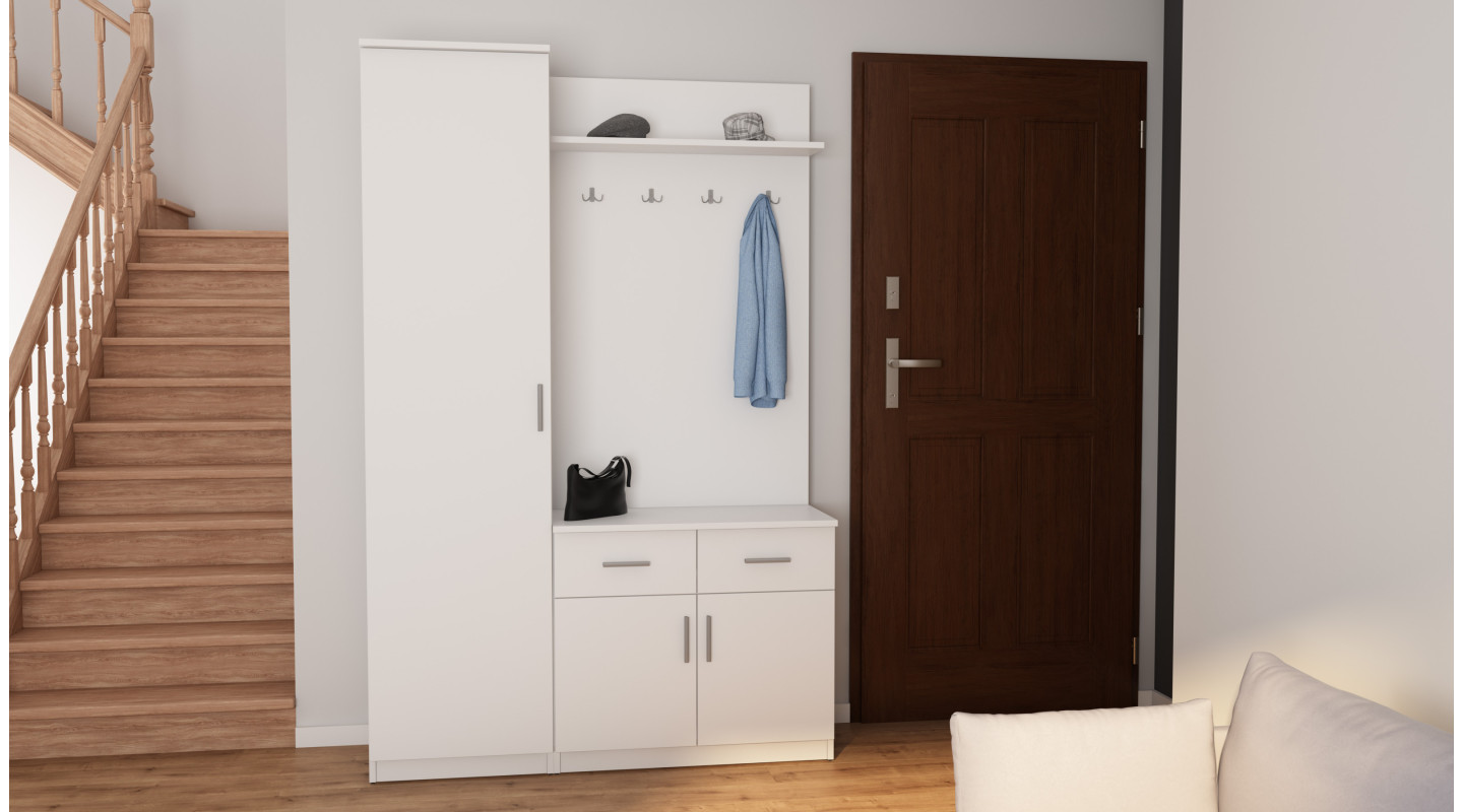 Flur 130 - Flurschrank mit Sitzbank, Schubladen, verschließbare Regale, Kleiderstange