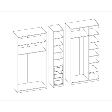 Die Funktionalität spiegeln Regale, Stangen und Schubladen wider. Das Set besteht aus 3 separaten Segmenten, die gemeinsam eine geräumige Garderobe und mehr bilden. Jedes Segment zeichnet sich durch unterschiedliche Funktionalität und Bestimmung aus, und durch die Verbindung aller erhalten Sie ein außergewöhnlich geräumiges Set mit Platz für alle Ihre Sachen. Wenn Sie möchten, können die Schränke auch separat aufgestellt werden, was ihr unbestreitbarer Vorteil ist.
