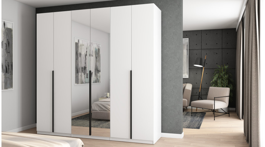 Ein moderner 6-türiger Kleiderschrank mit den Maßen 240x240 cm in weißer Farbe mit schwarzen Griffen ist ein Vorschlag für Personen, die Minimalismus mit einem ausdrucksstarken Akzent schätzen. Das klassische Weiß bringt Frische in den Innenraum und vergrößert optisch den Raum, während die schwarzen Griffe dem Möbel einen modernen, loftartigen Charakter verleihen. Der große Spiegel an der Front erfüllt nicht nur eine dekorative Funktion, sondern auch eine praktische – er erleichtert die tägliche Nutzung der Garderobe und hellt den Raum auf.