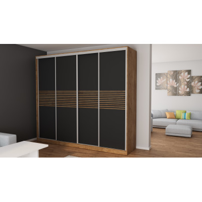 Die Schiebetüren haben wir mit modernen MDF-Leisten in holzähnlicher Struktur und Farbe verziert. Wir haben sie mit einer speziellen Laminatfolie in der Farbe des Möbelkorpus geschützt. Sie sind 4 mm dick und 15 mm breit und werden direkt auf die Tür geklebt (in einheitlicher matter Farbe – stark kontrastierend). Durch diese Behandlung erhielten die Möbel einen unglaublichen 3D-Effekt.