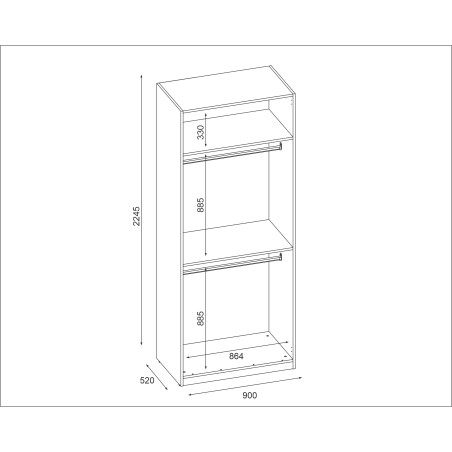 Der modulare Kleiderschrank 90x225 cm mit Regalen und zwei Kleiderstangen ist eine ausgezeichnete Wahl für alle, die ein effizientes System zur Aufbewahrung hängender Kleidung benötigen, während sie gleichzeitig Ordnung und Ästhetik im Innenraum bewahren. Gehörend zur Serie System MAX Premium, bietet er erhöhte Funktionalität dank der doppelten Kleiderstange, was ihn zur idealen Lösung u.a. für Paare, Familien oder Nutzer mit einer umfangreichen Garderobe macht.