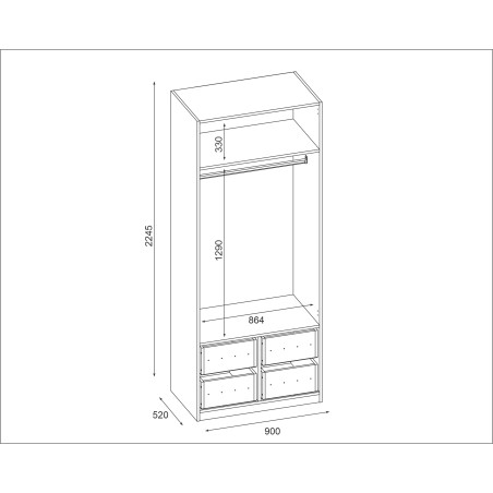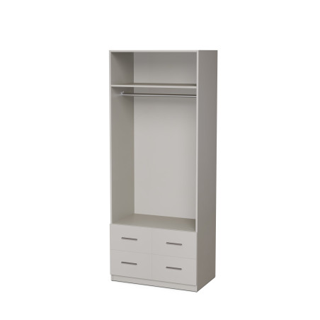 Der modulare Kleiderschrank 90x225 cm mit Kleiderstange, Schubladen und Regalen ist ein funktionelles Möbelstück aus der Serie System MAX Premium, entwickelt für anspruchsvolle Nutzer, die maximale Kapazität und Komfort im täglichen Gebrauch suchen. Die Kombination aus drei verschiedenen Arten von Hänge-, Regal- und Schubladenflächen macht diesen Schrank zum perfekten zentralen Element der Ausstattung von Ankleidezimmern, Schlafzimmern oder Fluren.