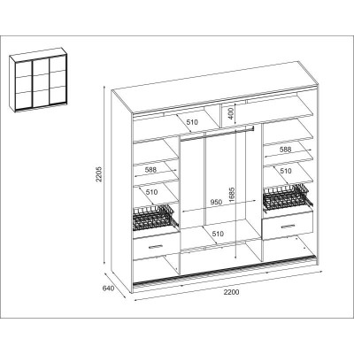 Schiebeschrank 3D/220 - Kleiderstange, Körbe, Regale, Schubladen