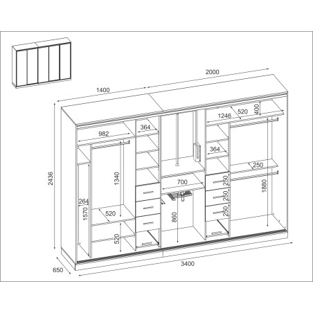 Schrank 5D/340 - Kleiderstangen, Kleiderlift, Hosenauszug, Krawatten- und Gürtelhalter, Schubladen