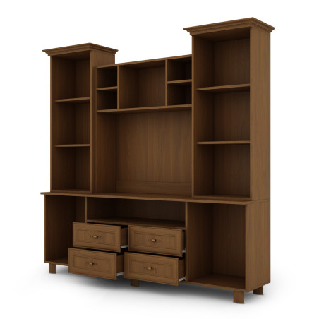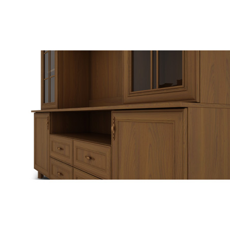 Neben dem Fernsehbereich befinden sich zwei Vitrinen, die zusätzlichen Platz für die Aufbewahrung und Präsentation von Sammlerstücken bieten. Jede der Vitrinen ist mit Regalen ausgestattet, auf denen Sie verschiedene Ornamente, Erinnerungsstücke oder Sammlungen platzieren können. Dank der verglasten Fronten sind diese Gegenstände deutlich sichtbar und schaffen einen angenehmen visuellen Effekt.