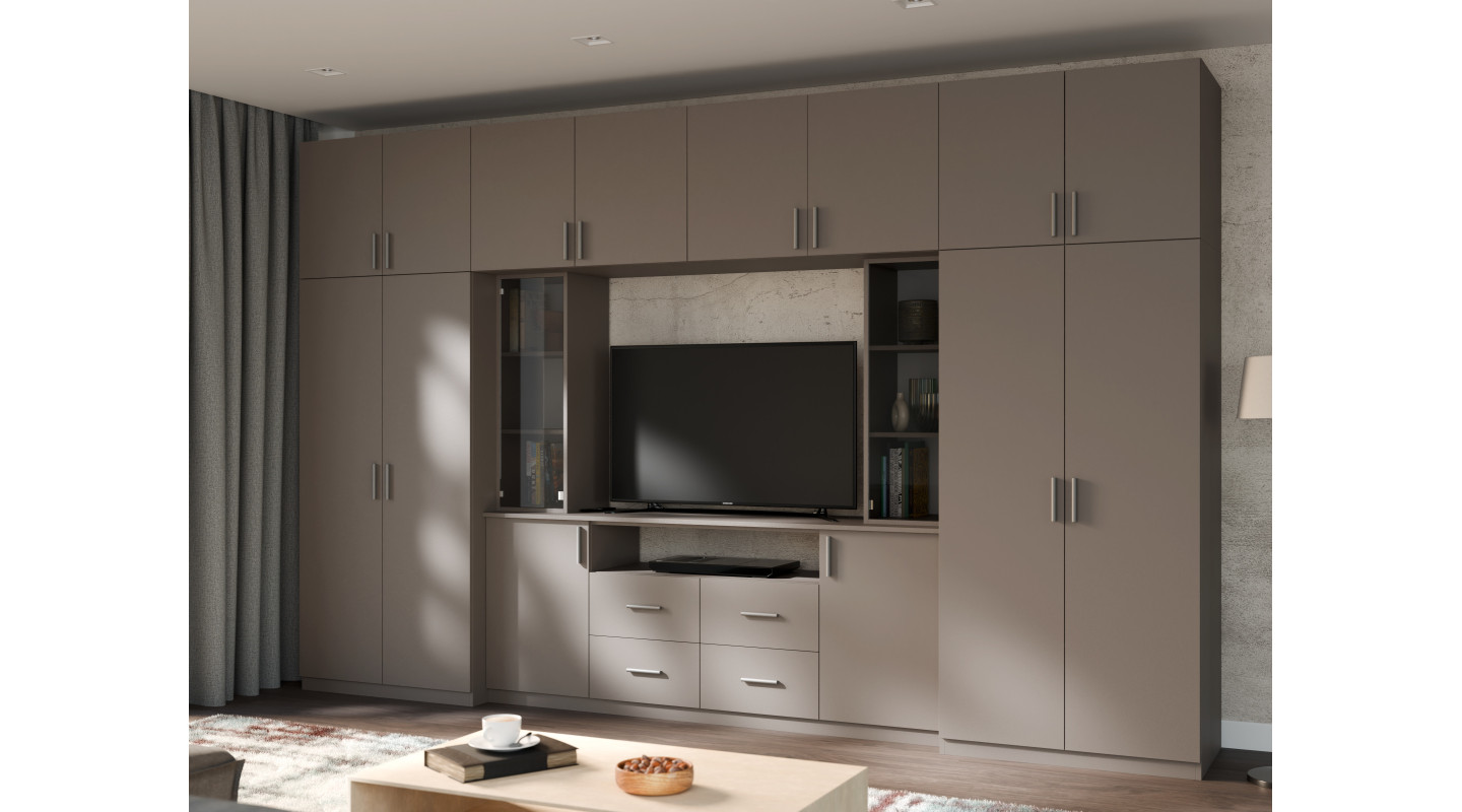 Moderne Wohnwand mit geräumigen Schränken und TV-Vitrine, 240 cm hoch - NESTO