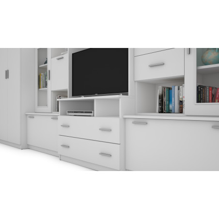 - einem TV-Schrank mit großem Fach für den Fernseher (sehr geräumige Schubladen unten) und Aufsatz in Form einer Glasvitrine.