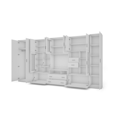 Das Möbelstück besteht aus einem großen Kleiderschrank mit Kleiderstange, einem Wäscheschrank mit fünf Regalboden, Glasvitrinen, Schubladen, Barschrank, offenen Fächern sowie einem großen Fach für den Fernseher. Es ist eine hervorragende Lösung für Personen, die viel Stauraum für verschiedene Gegenstände benötigen, von Kleidung über Bücher, Dekorationen bis hin zu elektronischen Geräten. Die Wohnwand LENA ermöglicht es, Ordnung im Raum zu halten und gleichzeitig einfachen Zugang zu benötigten Sachen zu gewährleisten.