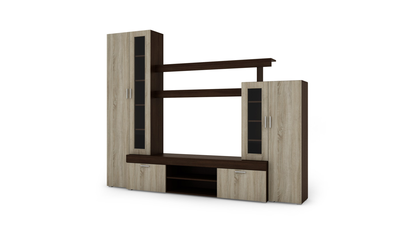 Die Apollo Wohnwand ist ein Möbelset, das miteinander harmoniert. Hergestellt aus hochwertigsten Möbelplatten, die kratz- und feuchtigkeitsbeständig sind. Ihre Kanten sind mit widerstandsfähiger PCV-Umleimung versehen. Das Ganze besteht aus mehreren Elementen, darunter: TV-Schrank, Regale, Vitrine und Schränke.