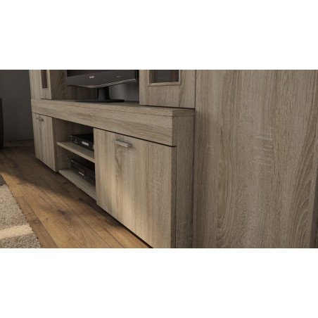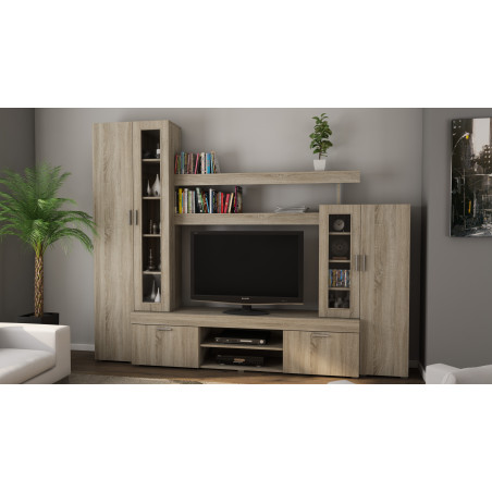 Die Apollo Wohnwand ist ein Möbelset, das miteinander harmoniert. Hergestellt aus hochwertigsten Möbelplatten, die kratz- und feuchtigkeitsbeständig sind. Ihre Kanten sind mit widerstandsfähiger PCV-Umleimung versehen. Das Ganze besteht aus mehreren Elementen, darunter: TV-Schrank, Regale, Vitrine und Schränke.