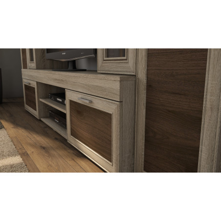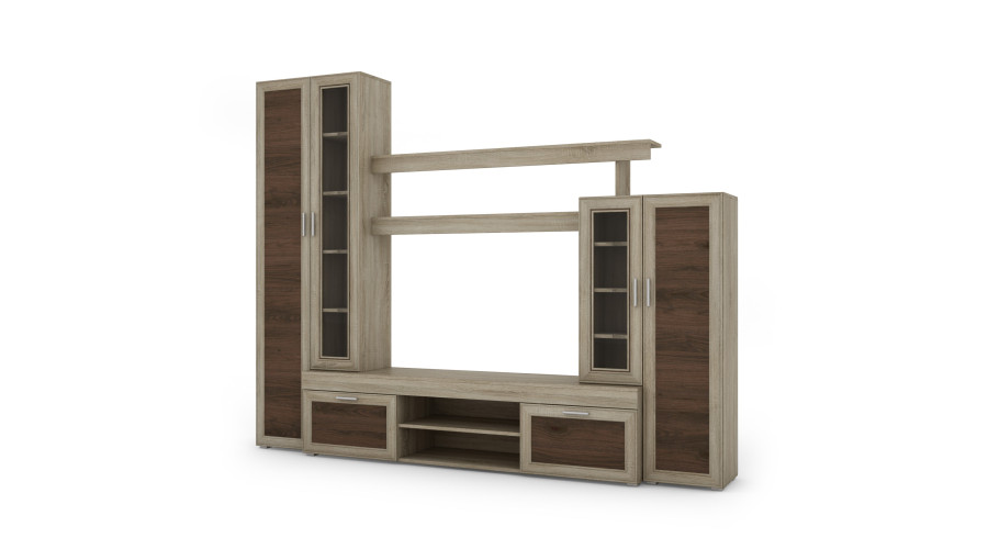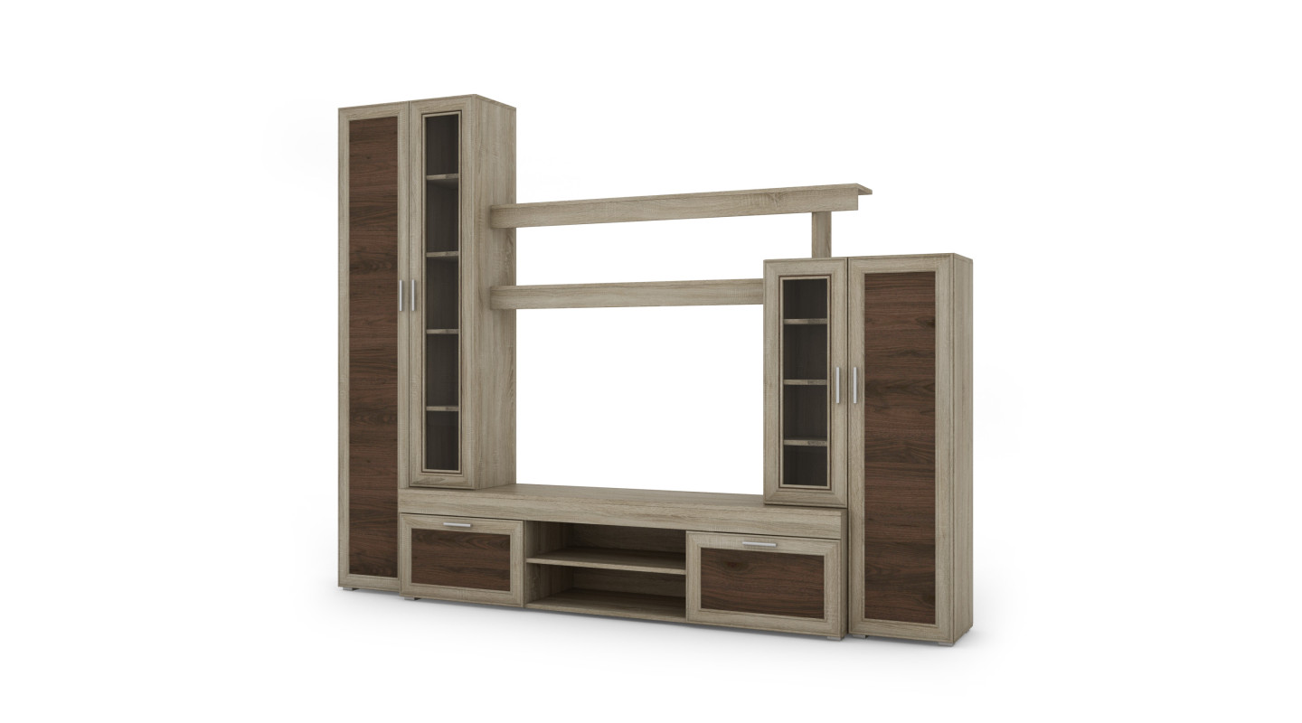 Die Apollo Wohnwand ist ein Möbelset, das miteinander harmoniert. Hergestellt aus hochwertigsten Möbelplatten, die kratz- und feuchtigkeitsbeständig sind. Ihre Kanten sind mit widerstandsfähiger PCV-Umleimung versehen. Das Ganze besteht aus mehreren Elementen, darunter: TV-Schrank, Regale, Vitrine und Schränke.