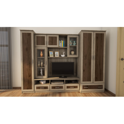 Die elegante Wohnwand Bosman besteht aus Schrank, Schubladen, Vitrinenschränken, Regalen und TV-Platz, der Ihnen freie Aufstellung des Fernsehers ermöglicht. Setzen Sie auf Möbel vom polnischen Hersteller und schaffen Sie Ihr Traumwohnzimmer.