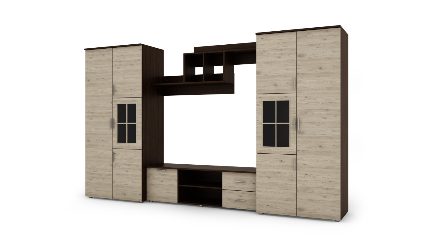 Die Wohnwand mit zwei Wäscheschränken und einem Multimedia-Schrank ist die perfekte Lösung für Personen, die funktionale Aufbewahrungsmöbel und eine elegante Ergänzung der Inneneinrichtung suchen. Sie ermöglicht optimale Raumnutzung und sorgt gleichzeitig für stilvolles Aussehen und Ordnung im Raum.