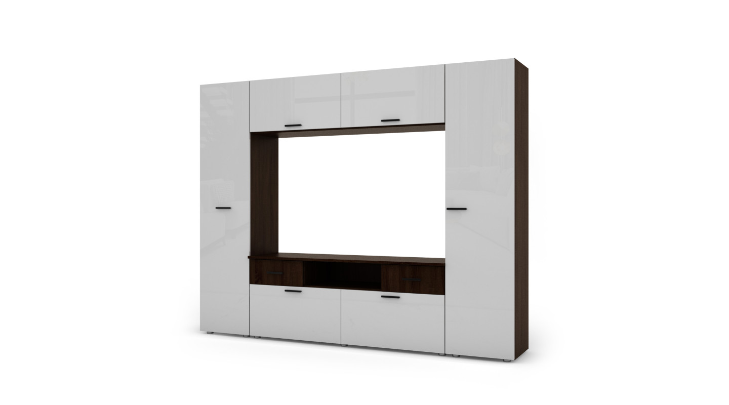 Die Wohnwand mit Multimedia-Schrank ist ein elegantes und funktionales Möbelstück, das sich perfekt in Ihrem Raum macht. Ein komplexes System, das Regale, Schränke und Raum für Unterhaltungselektronik vereint.
