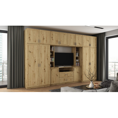 - verschließbaren Aufsätzen mit Einlegeböden über die gesamte Breite des Sets, wodurch die Gesamthöhe der Wohnwand bis zu 240 cm beträgt.