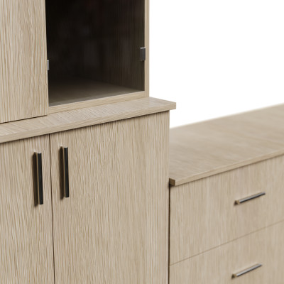 Vor allem, weil es eine durchdachte Verbindung von Ästhetik und Praktikabilität ist. Geräumige Schubladen sowie verschließbare Schränke eignen sich ideal als Aufbewahrungsort für Kleinigkeiten, Dokumente, Spiele oder Textilien. Der offene Bereich für den Fernseher und zusätzliche Regale ermöglichen eine bequeme Anordnung der TV-Geräte und das Ausstellen von Dekoration, ohne einen überladenen Effekt.