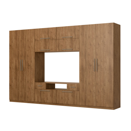 Warum lohnt es sich, SCANDI zu wählen? Wenn Ihnen geräumige Schränke mit Kleiderstangen auf verschiedenen Höhen wichtig sind, die sowohl lange Mäntel als auch kurze Blusen unterbringen – wählen Sie dieses Wohnwand-Modell. SCANDI hat neben den Schränken eine große Anzahl von Regalen, die sich ideal zur Aufbewahrung von Kleidung, Schuhen, Taschen oder Bettwäsche eignen. Außerdem fasst der TV-Schrank einen großen Fernseher und Audio-Video-Geräte. Und falls Ihnen das noch nicht genug wäre, hat SCANDI auch zusätzlichen Stauraum – einen Aufsatz, den Sie ohne Bohren in die Wand montieren können.